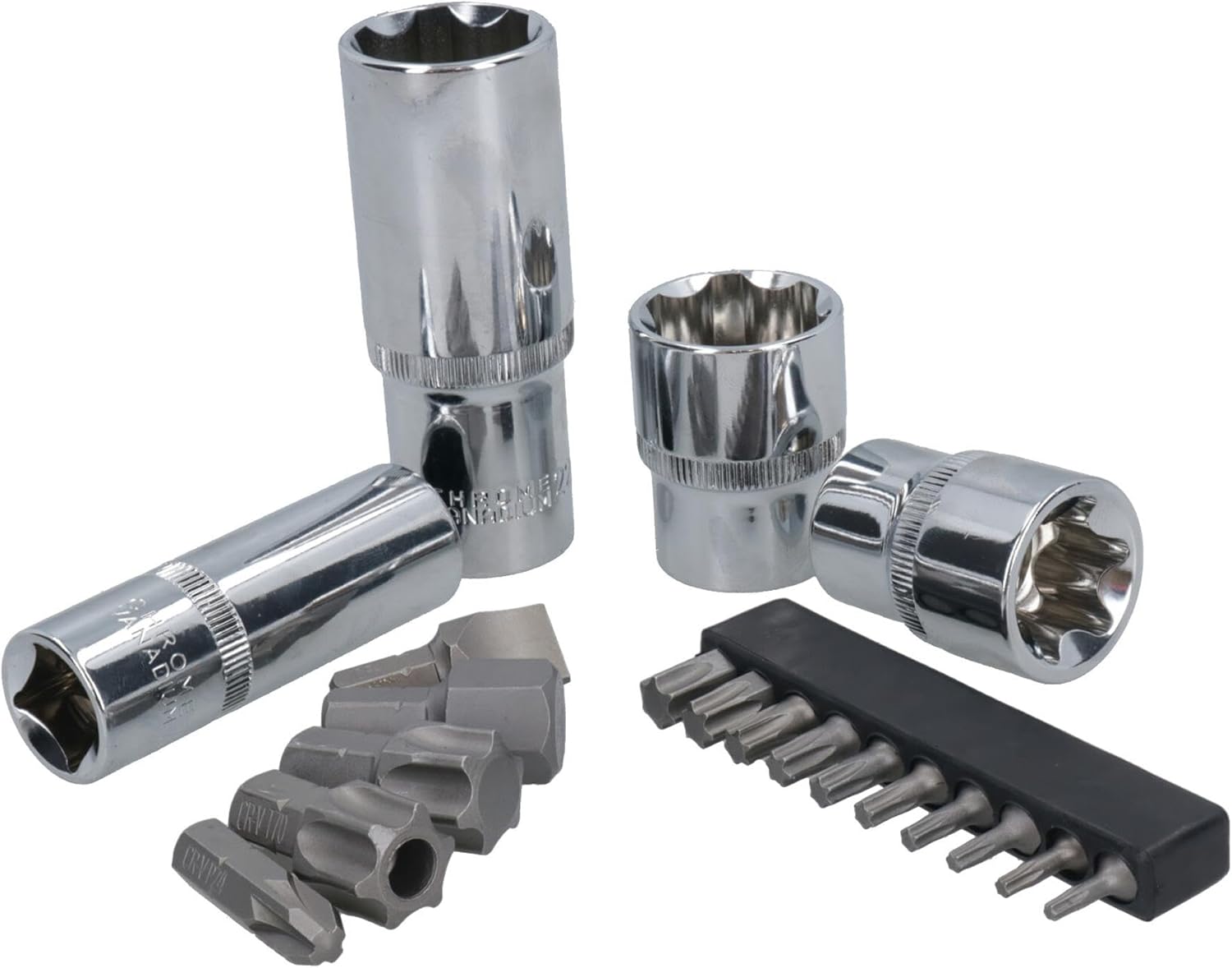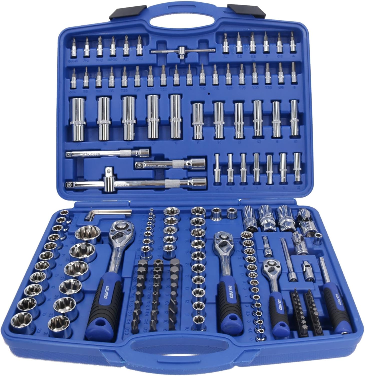 Professional tool for commercial or occasional use. Professional socket set for everyday commercial or occasional use. All size ratchets and sockets (1/4" / 3/8" and 1/2"). Manufactured from a high quality chrome vanadium steel for strength and durability. Metric sizes. SET INCLUDES THE FOLLOWING 1 x 1/4" drive 72 teeth ratchet handle 1 x 3/8" drive 72 teeth ratchet handle 1 x 1/2" drive 72 teeth ratchet handle 2 x 1/4" drive extensions 50mm / 100mm 1 x 3/8" drive extensions 125mm 2 x 1/2" drive extension 125mm / 250mm 3 x universal joints 1/4" / 3/8" and 1/2" drive 1 x 1/4" drive spinner handle 2 x couplers 1/4" / 3/8" and 1/2" 1 x 1/4" drive sliding T Bar 1 x 3/8" drive 18mm spark plug socket 2 x 1/2" drive spark plug sockets 16mm and 21mm 1 x 1/2" drive 3 way adapter 7 x Allen keys 1.27mm / 1.5mm / 2mm / 2.5mm / 3mm / 4mm and 5mm 13 x 1/4" drive shallow sockets 4mm / 4.5mm / 5mm / 5.5mm / 6mm / 7mm / 8mm / 9mm / 10mm / 11mm / 12mm / 13mm and 14mm 7 x 1/4" drive deep sockets 4mm / 5mm / 6mm / 7mm / 8mm / 9mm and 10mm 10 x 3/8" drive shallow sockets 10mm / 11mm / 12mm / 13mm / 14mm / 15mm / 16mm / 17mm / 18mm and 19mm 6 x 3/8" drive deep sockets 10mm / 11mm / 12mm / 13mm / 14mm and 15mm 17 x 1/2" drive deep sockets 10mm / 11mm / 12mm / 13mm / 14mm / 15mm / 16mm / 17mm / 18mm / 19mm / 20mm / 21mm / 22mm / 24mm / 27mm /30mm and 32mm 5 x 1/2" drive deep sockets 16mm / 17mm / 18mm / 19mm and 22mm E Type 1/4" sockets E4 / E5 / E6 / E7 and E8